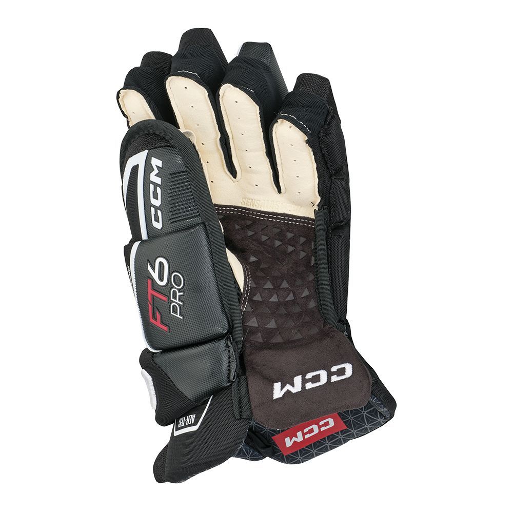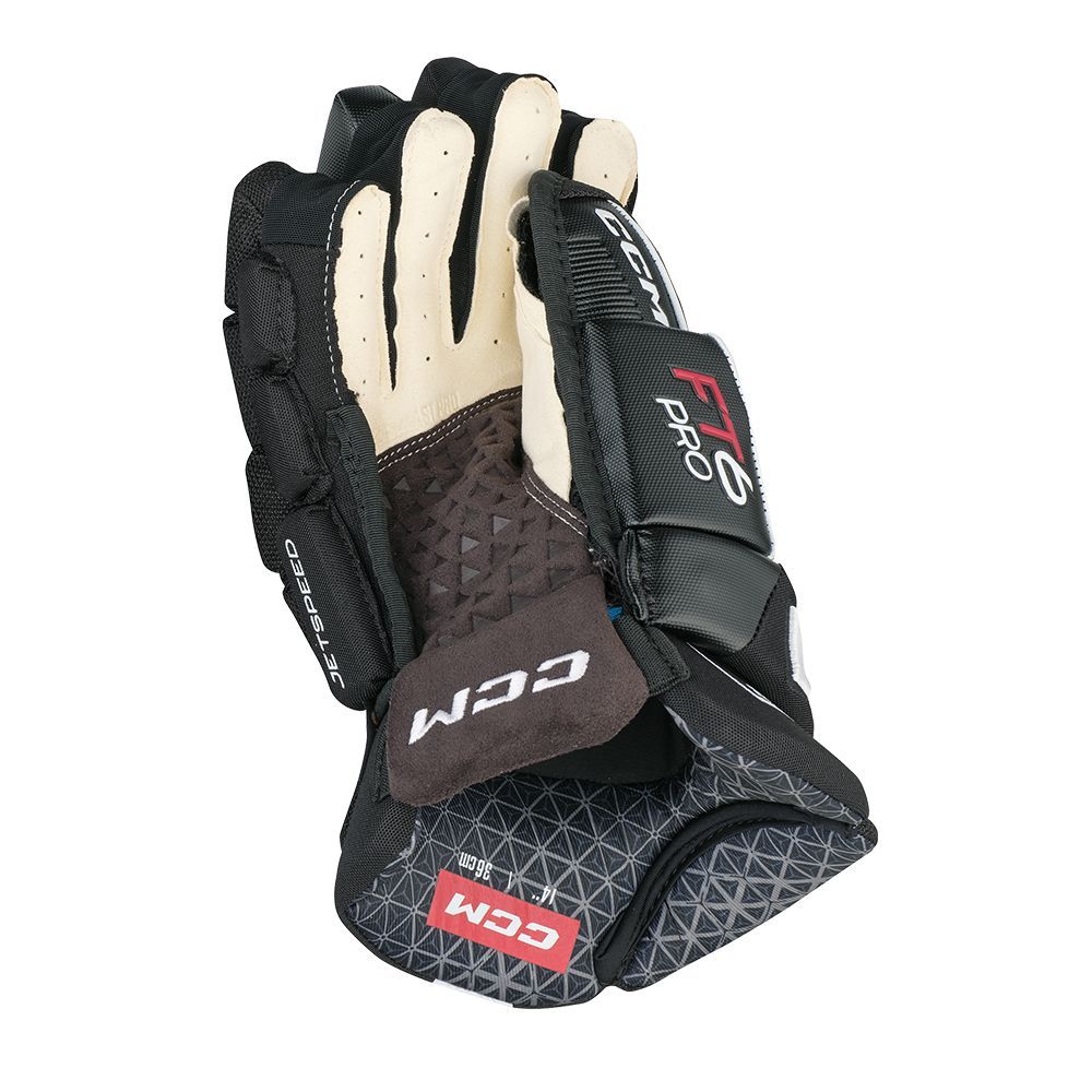 Ладошка перчатки: обновленная ладошка перчатки Jetspeed FT6 Pro представляет из себя комбинацию из уже хорошо известного материала PRO CLARINO и абсолютно нового материала SENSALAST с рельефной текстурой. Эта сочетание обеспечивает не только долговечность перчаток, но и хорошее сцепление с клюшкой. Бесшовный переход от манжеты к ладони создан для максимально комфортной игры.